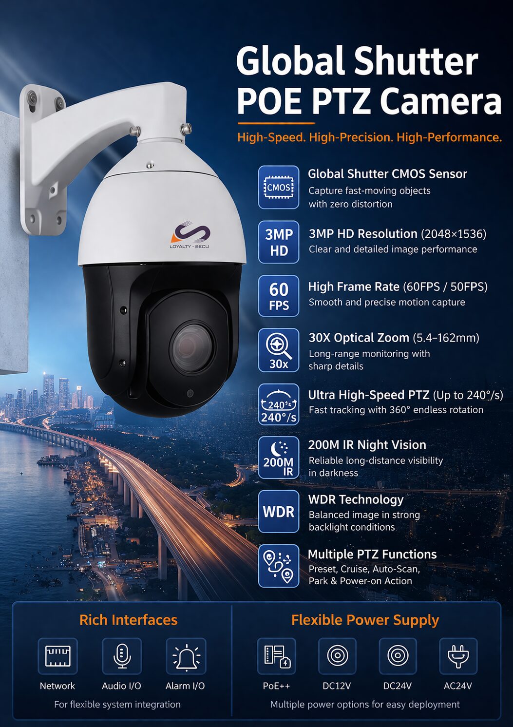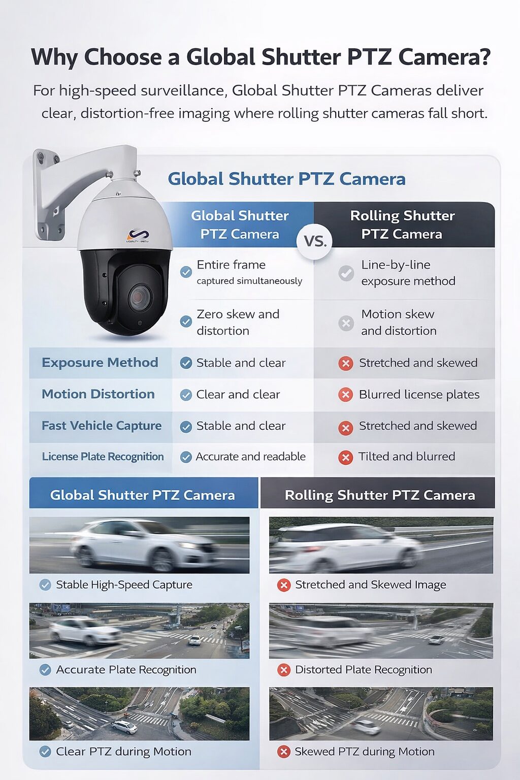 A Global Shutter PTZ Camera ensures accurate imaging, reliable analytics, and professional performance for modern traffic and intelligent surveillance systems.