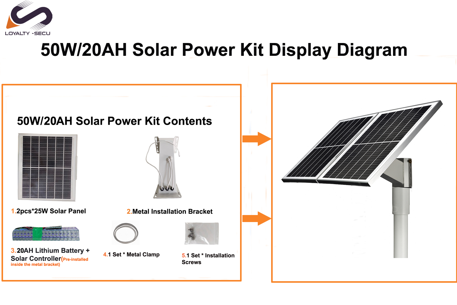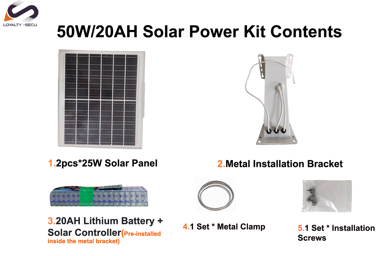 2PCS * 25W Solar Panel,1PCS* 20AH Lithium Battery,1PCS * Installation Bracket,