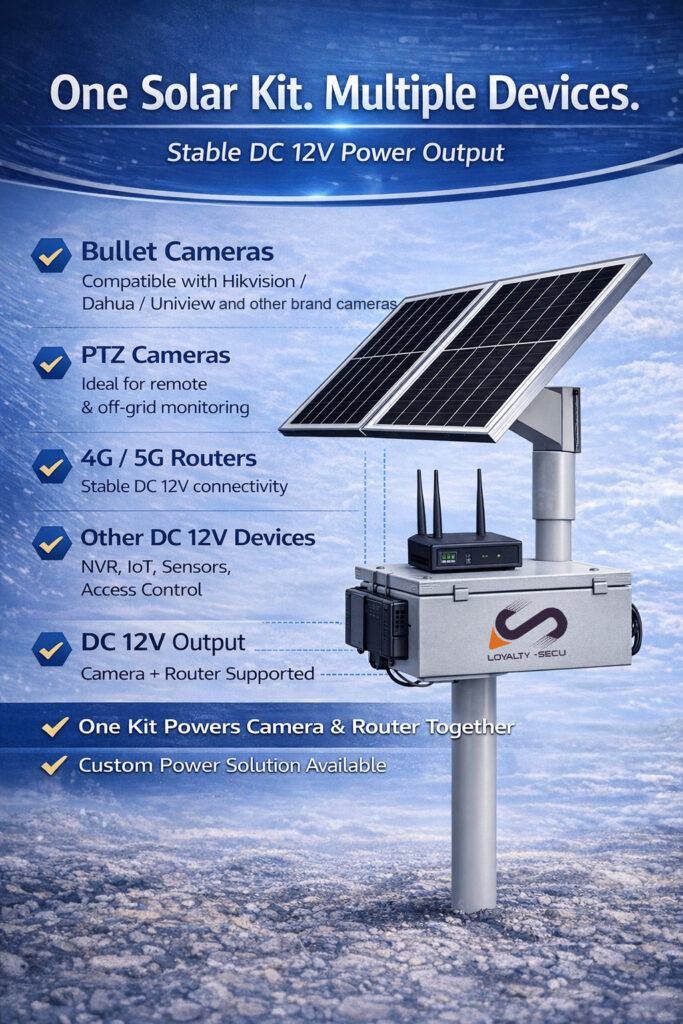 No Lock-In. No Brand Limitation Designed with standard DC 12V output, LOYALTY-SECU solar kit works seamlessly with mainstream cameras such as Dahua, Hikvision, Uniview, and more. Integrators can easily integrate the system into existing projects without changing devices or suppliers — integrate freely, no vendor lock-in.